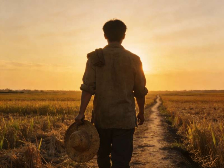 稻子已经收完了,田里留着整齐的稻茬。风从北边吹过来,带着河水的湿气,也带着新翻的泥土味。他走得很慢,破草帽拿在手里,一下一下轻轻拍着腿侧。